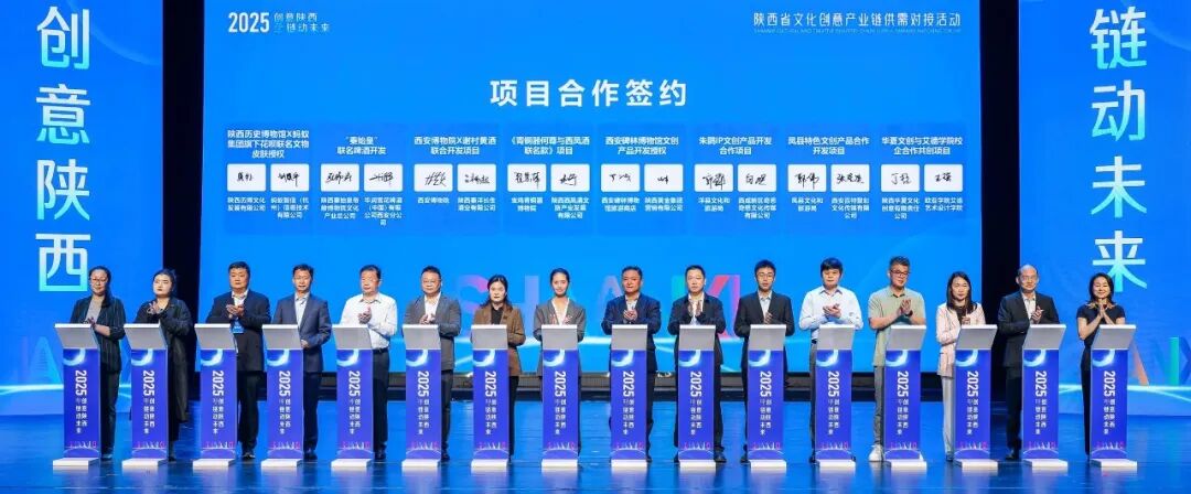 活动开始前,徐明非副省长等领导嘉宾参观陕西文创IP授权展。 本次活动在筹备过程中围绕促成产业链上下游供需有效对接这一核心目标,广泛征集产业链上下游企业需求,精心组织了一场供需对接专题活动,以及文创IP授权展和文创IP授权分享、自由洽谈、“路演”推介三项配套活动。活动创新打造了“线上AI匹配+线下撮合洽谈”对接模式,实现充分调动各方资源力量,高效促成更多合作的目标。 在9月28日举行的供需对接专题活动现场,易点天下、优扬文化、中丝集团分别围绕数智赋能文化出海、IP全球商业化开发、时尚宣推文化IP进行主旨演讲,为陕西文创IP发展提供全球视野与实践参考。 陕西省非遗品牌共创中心、陕西历史博物馆、《赳赳大秦》、华山景区、西影集团、陕西省图书馆围绕打造“非遗+文物+演艺+名山+影视+阅读”IP矩阵进行推介,全面展现陕西文创资源的丰富性与可塑性。陕西省文化产业协会发布《2025陕西文化创意产业蓝皮书》,为产业发展提供数据支撑与路径指引。 活动现场举行项目合作签约 活动推介了30余款兼具文化内涵与市场潜力的创意新品,见证了签约金额约2亿元的85组项目成功签约,标志着陕西文创产业从“资源展示”向“商业落地”的实质性突破。此外,还通过“精准画像”与需求匹配,促成了52项合作意向的达成,进一步凝聚了跨行业、跨领域协同发展的新合力,为我省产业未来注入了强劲的金融“活水”与市场机遇。 本次活动吸引了香港贸发局,北京、上海、浙江、四川、深圳等省市行业协会,《时装》杂志、路易威登、优扬文化、中丝集团、国家对外文化贸易基地(上海)、华为、骏飞实业、宇树科技、抖音、有赞、携程、美团、同程,蔚来、极氪、李宁、得力文具等企业代表和国内外顶级文创IP客商超500人参加。 省文化和旅游厅将以本次活动的举办为契机,积极引导全省各市区和经营主体发挥好资源、政策、人才和场景四大优势,坚持守正创新、合理利用原则,牢固树立“链群”发展思维。同时,加强政策引导,推动文化资源加速转化为可授权、可共创、可赋能的文化资产,切实把三秦大地的文化软实力变成高质量发展的硬实力。