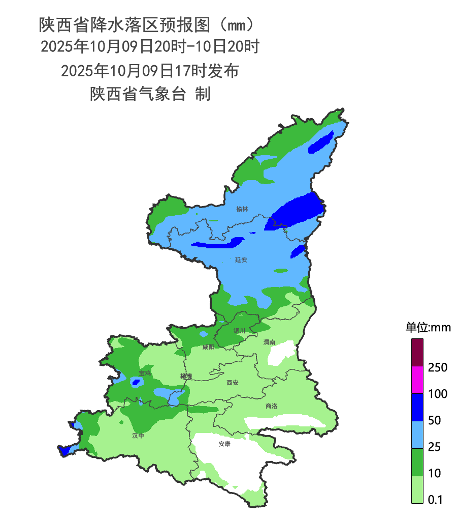 预计10月9日20时至10日20时榆林大部、延安大部、宝鸡南部局地、咸阳北部局地、西安西部局地、汉中西部局地有大雨(25~50毫米),其中榆林东部局地(神木市、府谷县、绥德县、佳县、吴堡县、清涧县、子洲县)、延安北部局地(安塞区、吴起县、志丹县、子长市、延川县、延长县)、宝鸡南部局地(渭滨区、凤县)、汉中西部局地(略阳县、宁强县)有暴雨(50~80毫米)。上述部分地区伴有短时强降水(最大小时降雨量10~30毫米)。