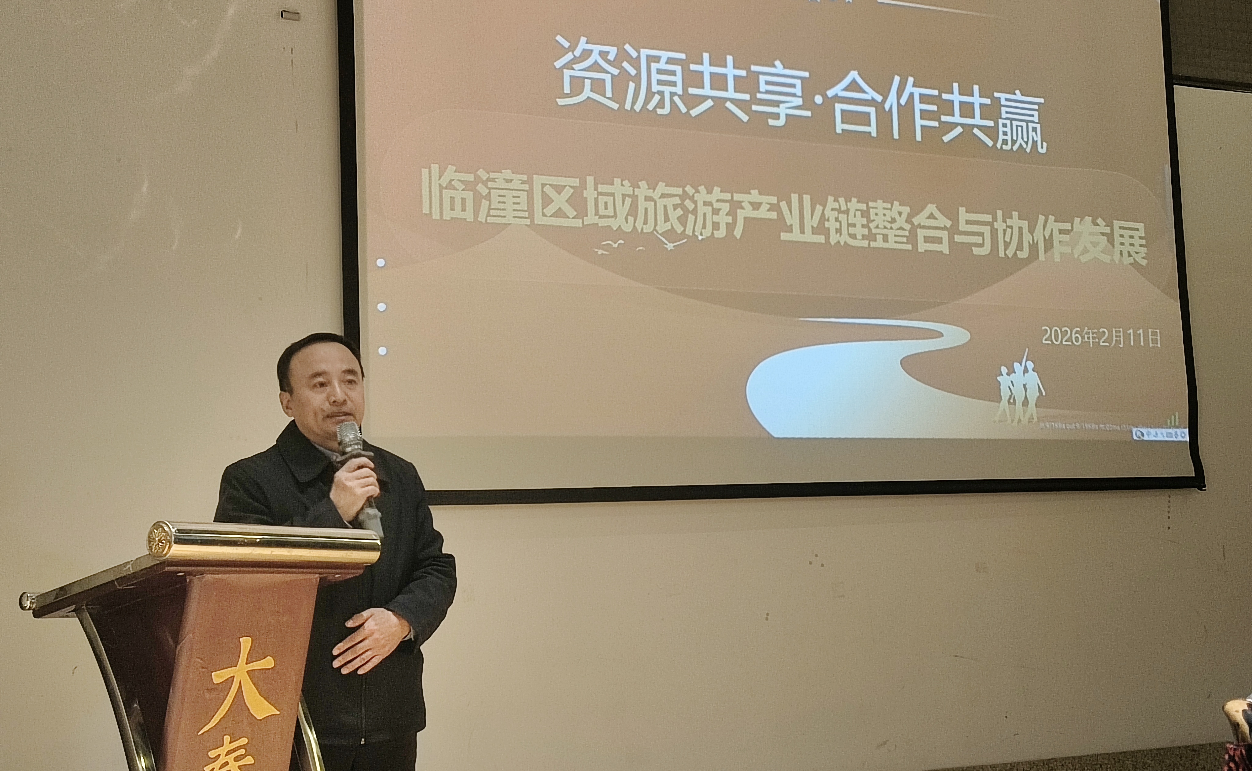 陕西省旅行社协会副会长兼临潼分会会长高军讲话。他系统回顾了分会成立以来的工作成效,并围绕“资源清单化、产品定制化、服务标准化”三大方向,重磅发布了首批临潼区域优质资源整合成果。分会办公室主任王辉以详实的数据、生动的案例,详细阐述了下一步资源对接的具体路径与操作方案。报告既有顶层设计的战略考量,又有落地生根的务实举措,赢得现场阵阵掌声。